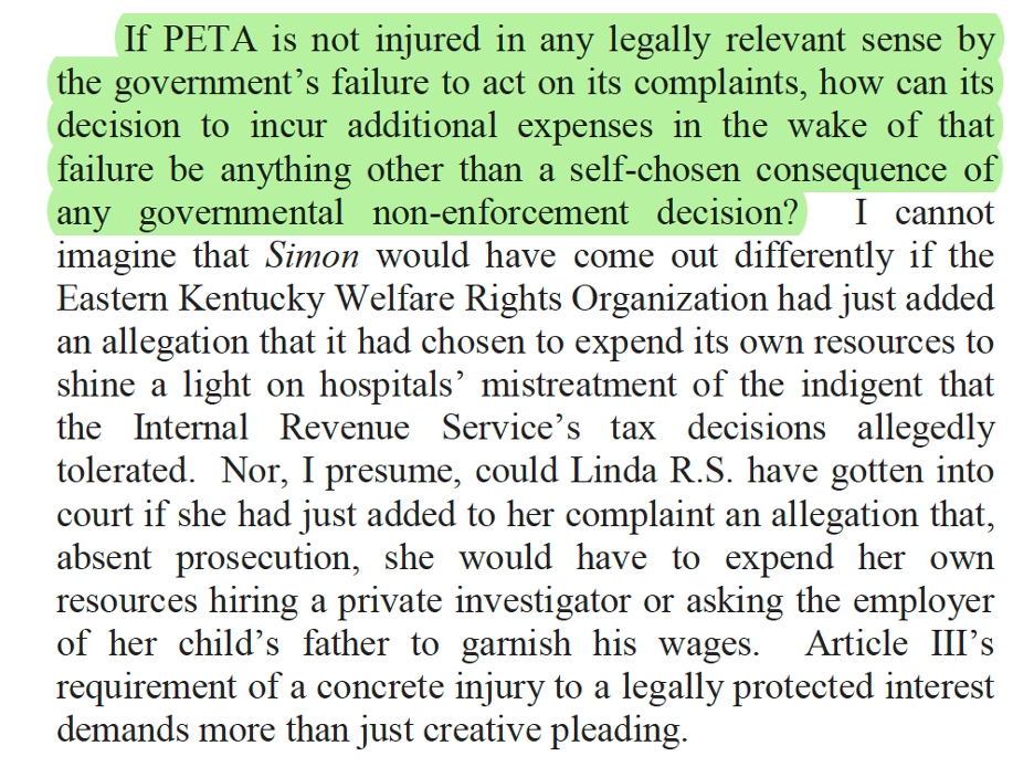 The dubitante (literally “doubting”) opinion, a delightful but seldom used species of concurrence, signals that the author has joined an opinion that she doesn’t really believe in, usually because of bad precedent. Judge Millett’s PETA opinion captures the spirit of the form perfectly: while showing proper respect for stare decisis (oops, there’s another one), she casts serious doubt on the doctrine of organizational standing—and she does so with impeccable style.